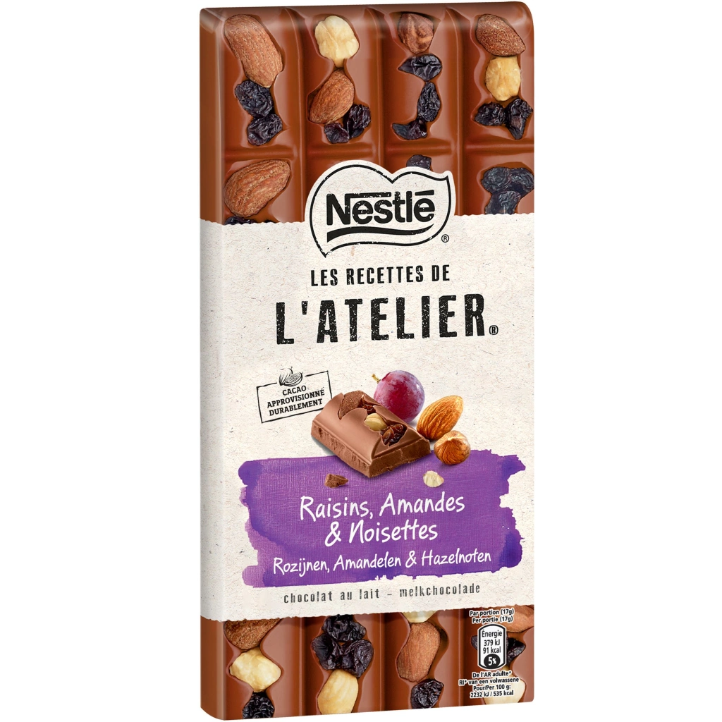 Tablette de chocolat au lait aux raisins, amandes et noisettes